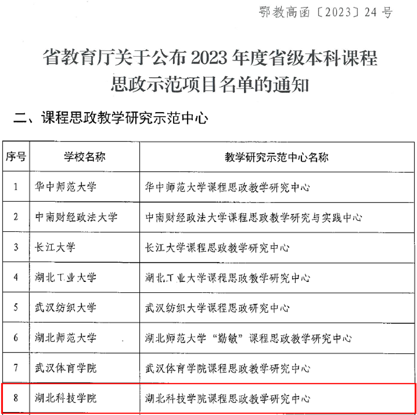近日,湖北省教育厅公布了2023年度省级课程思政示范项目名单(鄂教高函〔2023〕24号),我校课程思政教学研究中心成功入选省级课程思政教学研究示范中心项目。