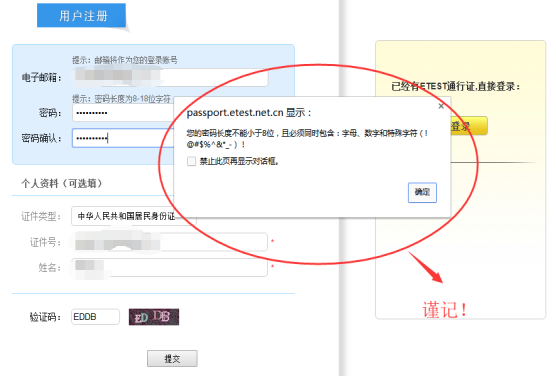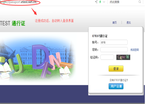 注册完成后,用上述注册的账号登录平台(地址:http://passport.etest.net.cn),修改个人资料及密码。