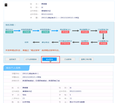 考生在报名信息页面,点击“笔试报考”按钮,进入笔试报考页面。考生根据个人情况选择要报考的科目(如英语四级或英语六级等),并点击“提交”按钮,确认笔试报名信息。