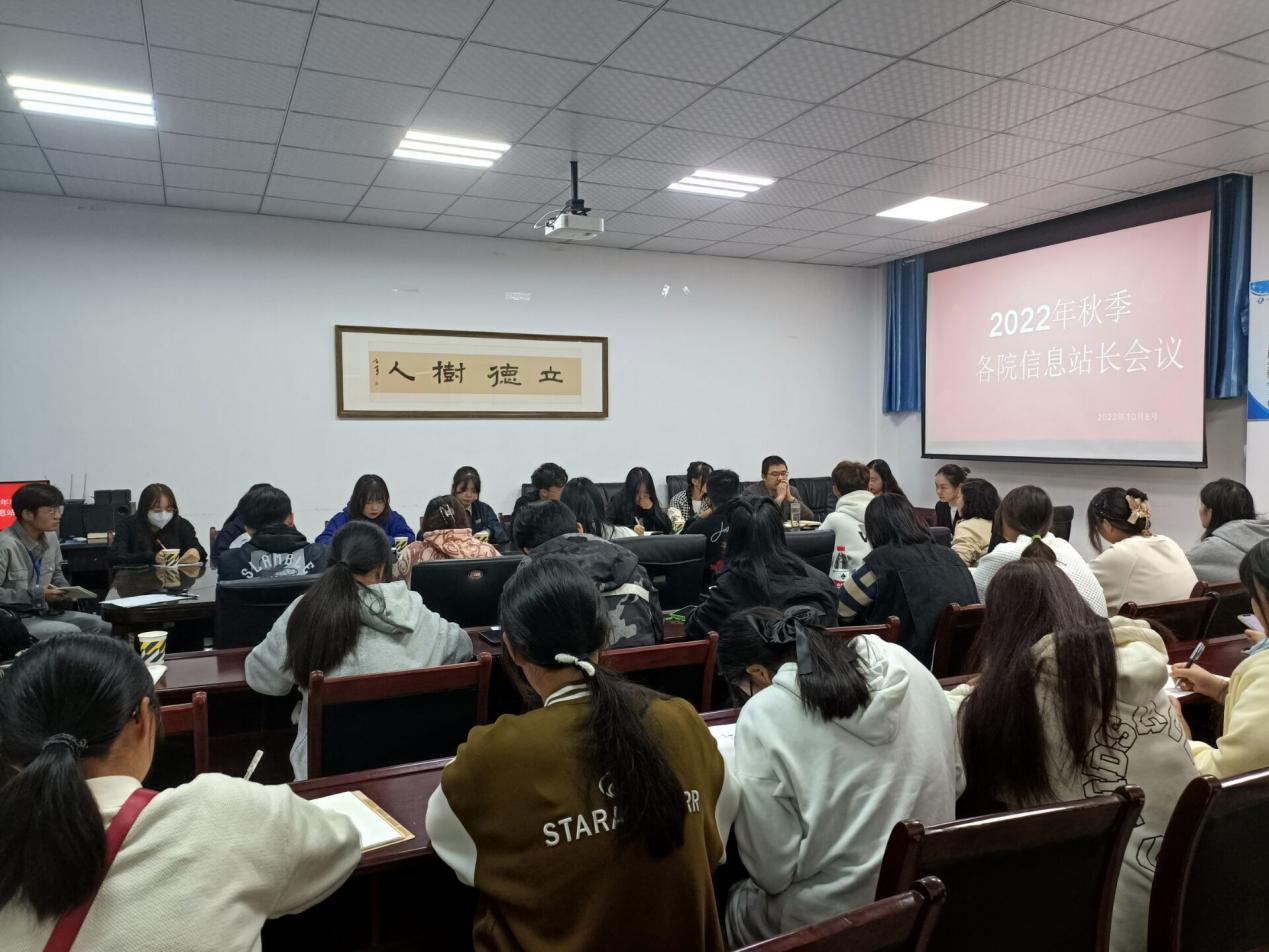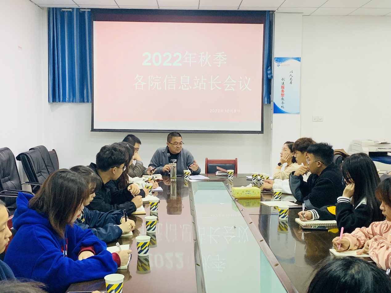 10月8日下午,教务处在行政楼2楼会议室召开了2022秋季学期第一次学生信息员工作会议,教务处有关人员、18个教学院部学生信息站站长、学生会学术创新部全体学生干部参加了会议。
